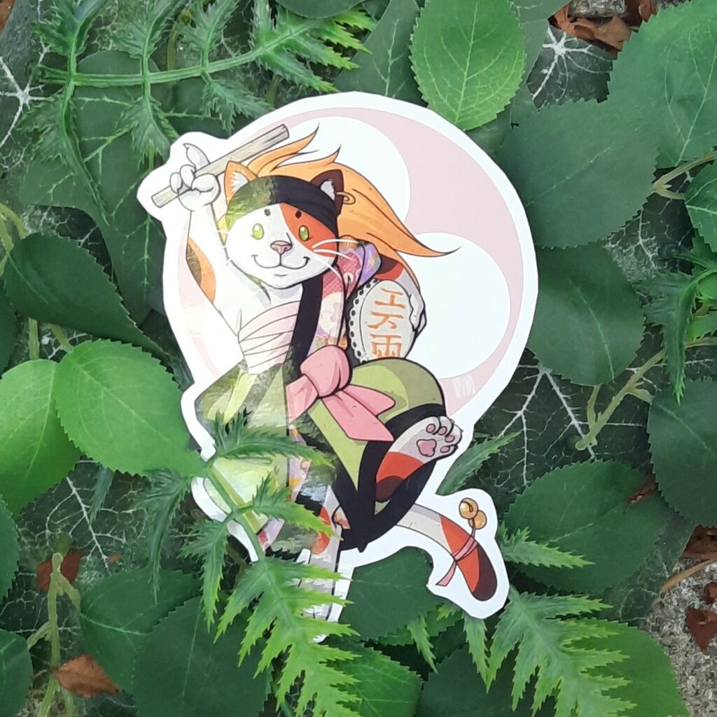 J’avais créé ce petit manekineko pour symboliser la culture Japonaise, en reprenant les trames des mangas, les 4 couleurs, comme demandé, et des taches de peinture, pour l’art.